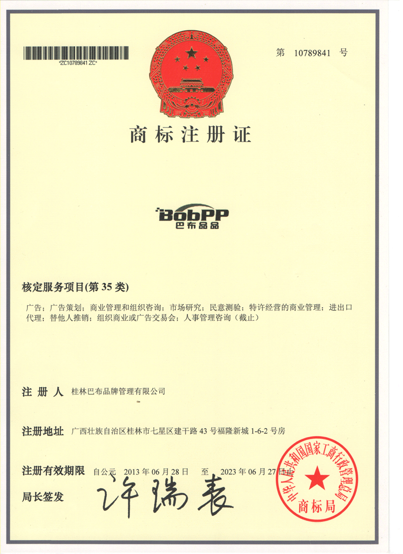 国家工商总局商标局颁发商标注册证,第10789841号,BobPP(巴布品品)商标注册成功。