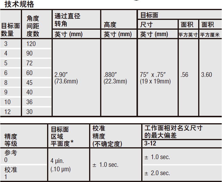 所有尺寸:平面度和平行度 –顶和底面 –.00005" ; 最大多边体误差±15秒